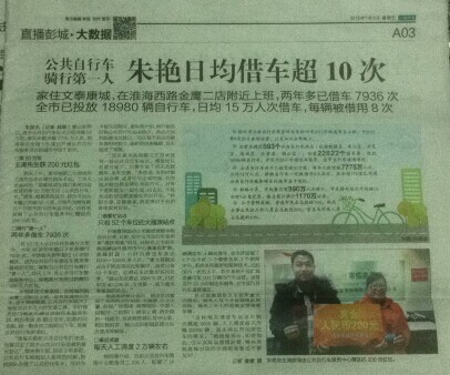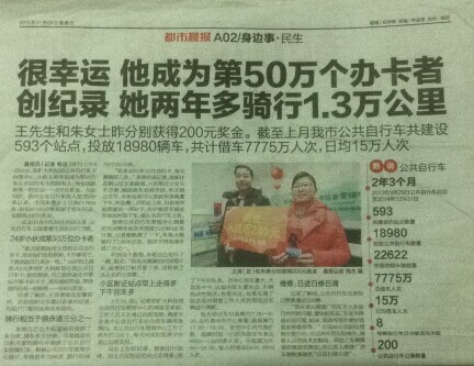 王先生和朱女士昨分別獲得200元獎(jiǎng)金。截至上月我市公共自行車共建設(shè)593個(gè)站點(diǎn),投放18980輛車,共計(jì)借車7775萬人次,日均15萬人次