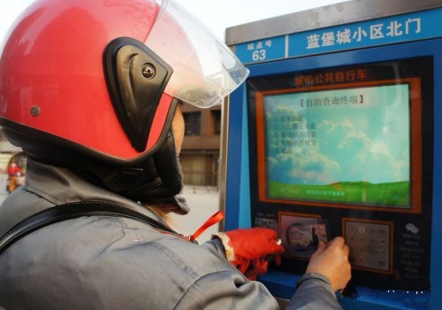 上午8時(shí)10分,李莉的手機(jī)又響了,是總部調(diào)度中心工作人員的電話(huà)。通知她阜陽(yáng)職院東門(mén)的公共自行車(chē)站點(diǎn)滿(mǎn)樁,請(qǐng)她速去處理。掛完電話(huà),李莉匆忙趕到站點(diǎn),已經(jīng)有兩位要存車(chē)的市民等候在此。李莉趕忙騰出足夠的“車(chē)位”,但由于高峰期時(shí)騰出的車(chē)位陸續(xù)有市民來(lái)還車(chē),所以卸車(chē)的工作也在不斷重復(fù)?!耙舫鰜?lái)一些空樁供市民還車(chē),多余的自行車(chē)通過(guò)總部調(diào)度重新分配到其他站點(diǎn)?!?李莉?qū)⒍嘤嗟淖孕熊?chē)按照一正一反的順序停放站點(diǎn)旁,用軟鋼繩拴在一起。然后在公共自行車(chē)查詢(xún)終端刷下工作卡,將備車(chē)數(shù)量輸入自助查詢(xún)系統(tǒng),上報(bào)終端。工作了近一個(gè)月,李莉?qū)ρ矙z員的工作已經(jīng)非常熟練。