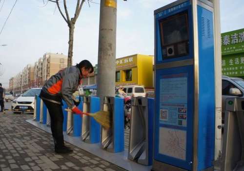 存放了一整夜的“小綠”,車(chē)身上早已蒙上一層灰塵,李莉打開(kāi)車(chē)筐,將抹布在水桶中清洗干凈,來(lái)回認(rèn)真擦拭著自行車(chē)車(chē)身和鎖車(chē)器,尤其是市民直接接觸到的刷卡區(qū)位置。隨后她拿起小笤帚掃落掉鎖車(chē)器卡口內(nèi)側(cè)的灰塵,打掃下周邊地面衛(wèi)生。立春后的清早,空氣中還滲透著絲絲寒意,記者此時(shí)的手腳已漸冰涼,但李莉的身影,卻一直忙碌在站點(diǎn)前。