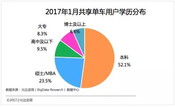 2017年1月共享單車用戶學(xué)歷分布方面,本科占比最多,達52.1%;碩士/mba占23.5%;高中及以下占9.5%。