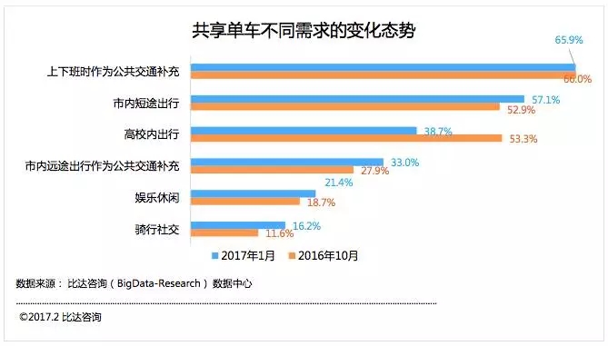 2017年1月共享單車不同需求變化態(tài)勢分布方面,相比較于2016年10月,高校內(nèi)出行由上半年的53,3%降至38.7%。而上下班作為交通補充,市內(nèi)短途出行比例變化不大。
